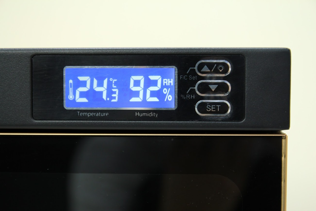 Cửa kính cường lực: Chắc chắn và trong suốt, cho phép chủ sở hữu kiểm soát thiết bị chỉ bằng ánh nhìn mà không cần mở tủ gây biến động độ ẩm.